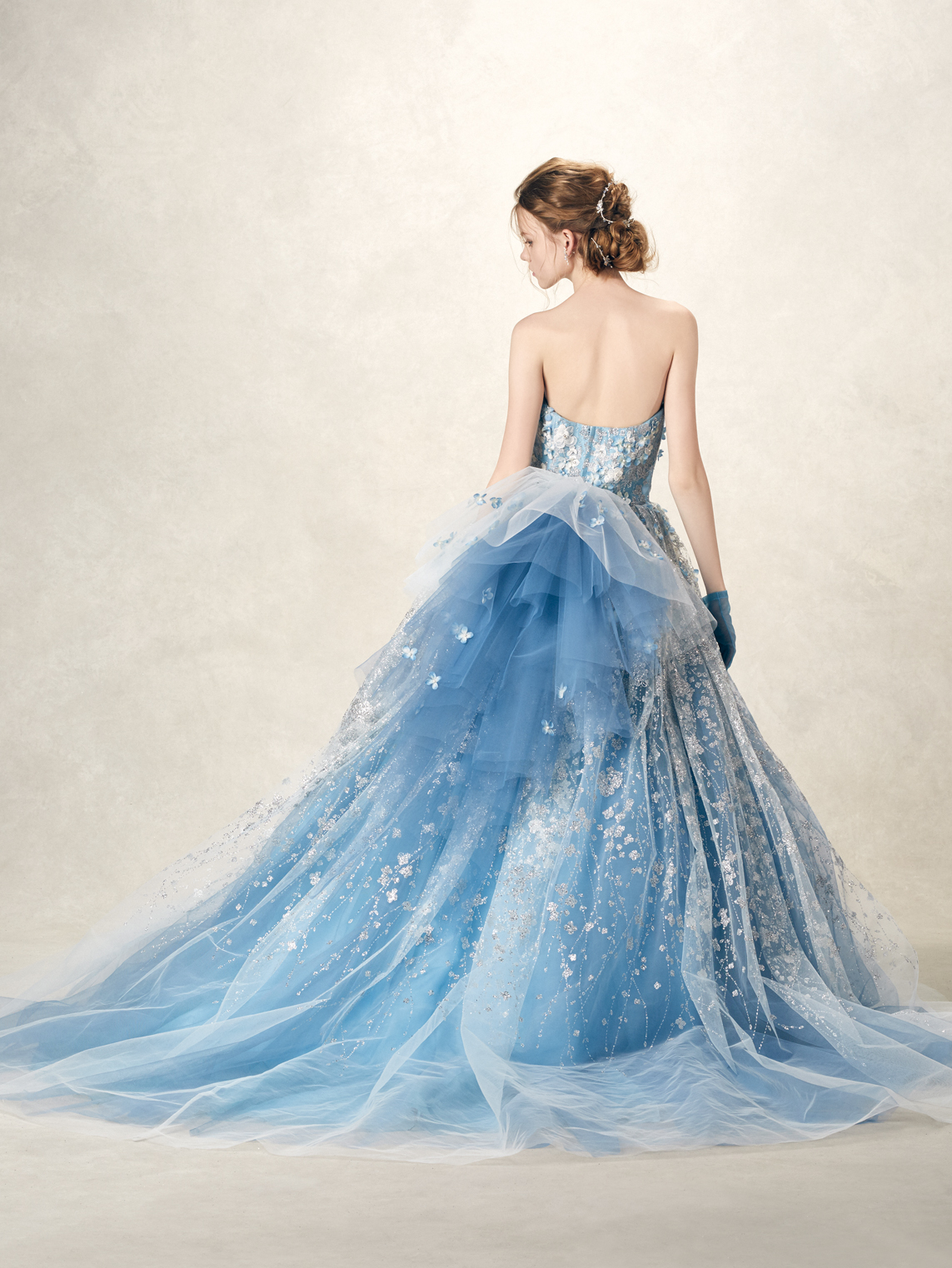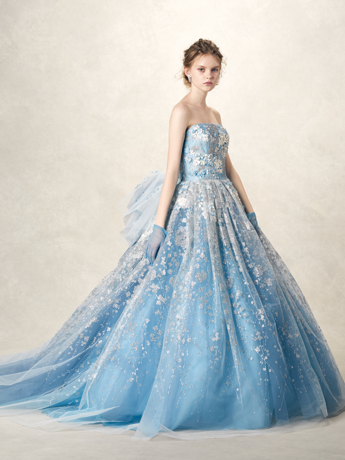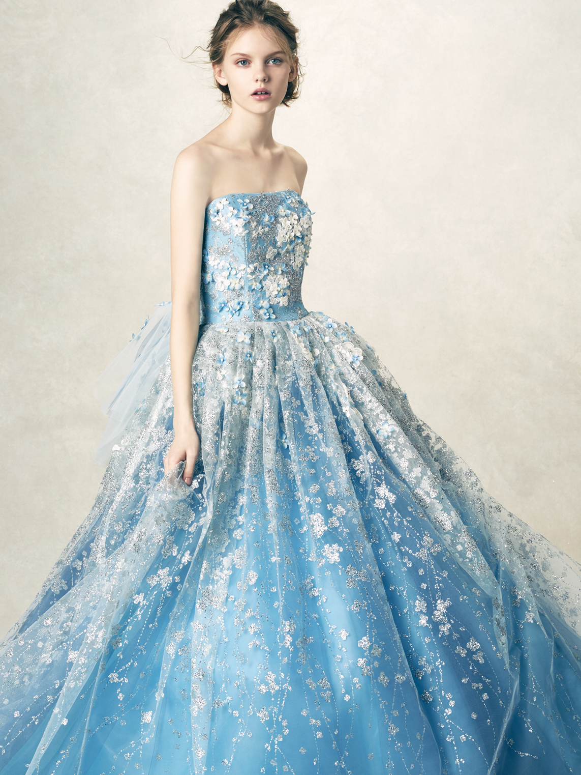 華やかな大人パステルで彩る極上スイート 立体感あるスピングル加工のフランス製あじさいモチーフを、あじさい柄のグリッターにのせた華やかな一着。可憐に舞う3Dフラワーにも注目して。