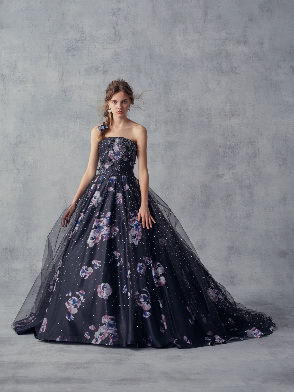華やかに纏うブラックドレス エレガントな胡蝶蘭を大胆にレイアウトした大人のフラワープリントドレス。プリントの上からグリッターチュールを重ねて、ブラックを華やかに演出。人とは違うおしゃれスタイルをブラックドレスで叶えて。