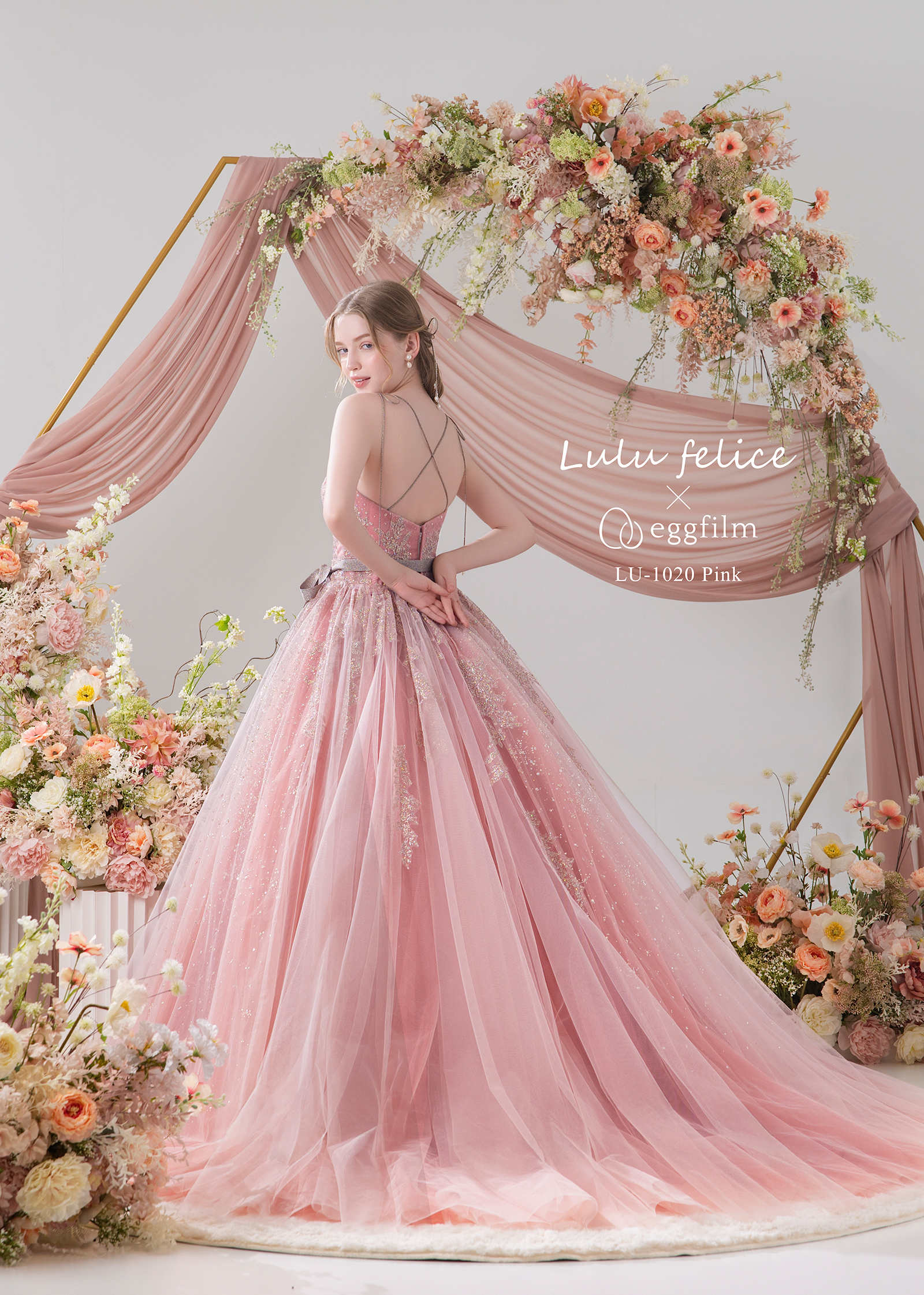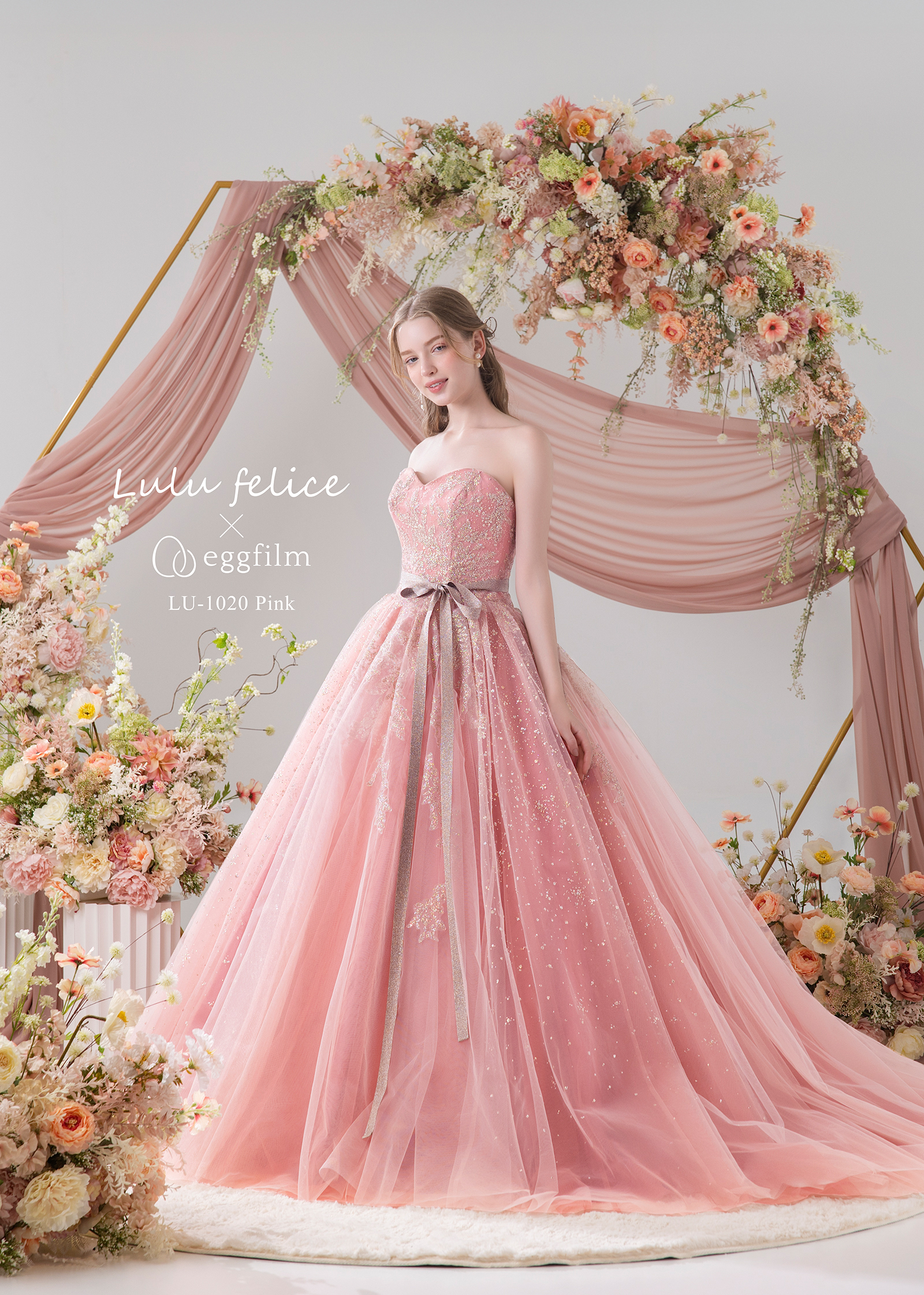 煌めくグリッターにゴールドの竹ビーズを散りばめ、ひと味違う輝きが魅力のグリッタードレスです。 胸もとはハートカットでデコルテラインをすっきりと見せ、ラメコードリボンのストラップの 先には淡水パールを一粒。ウエストリボンにもラメサテンを採用したこだわりが詰まったキラキラ好きの花嫁さまにおすすめの一着です(2025年12月末入荷予定)
