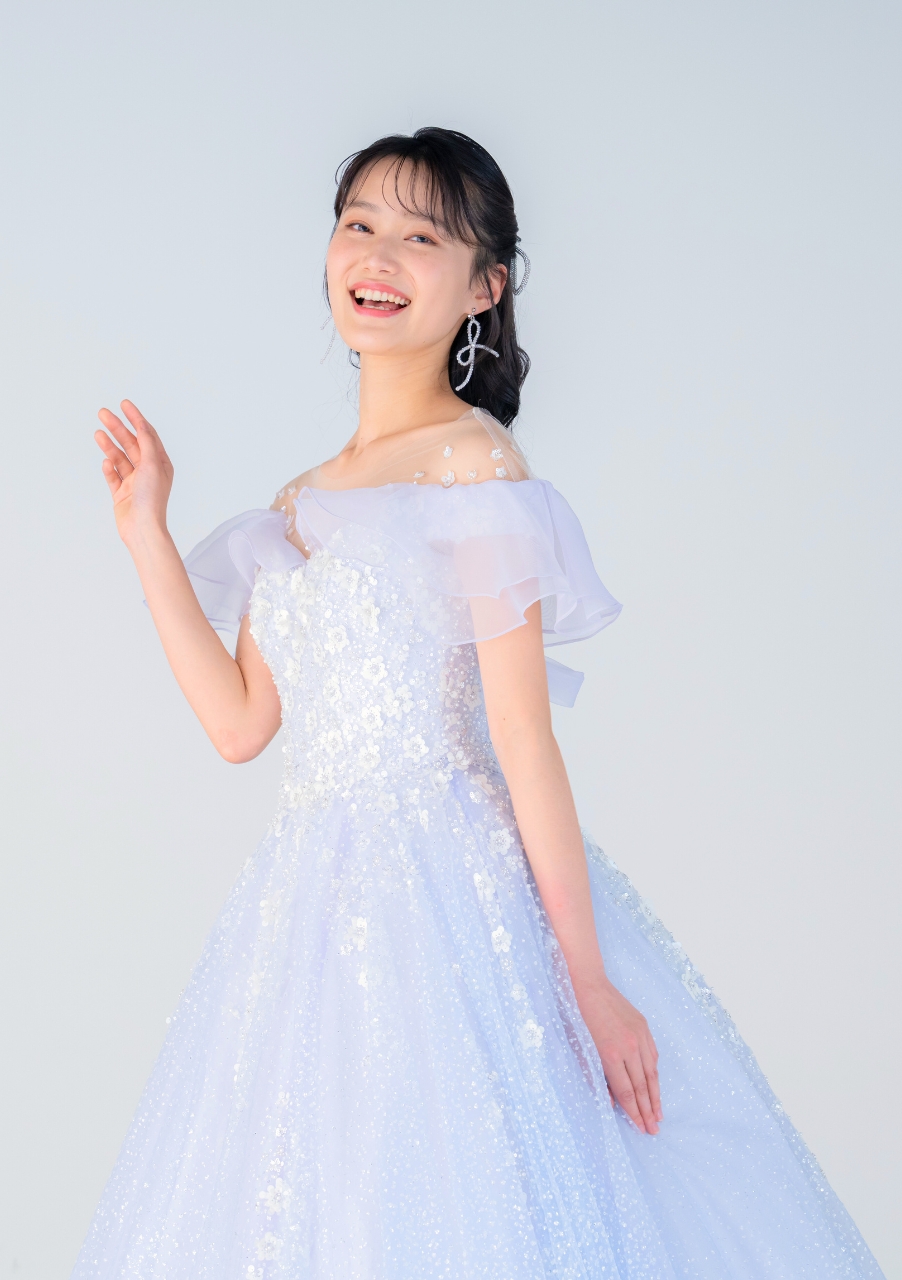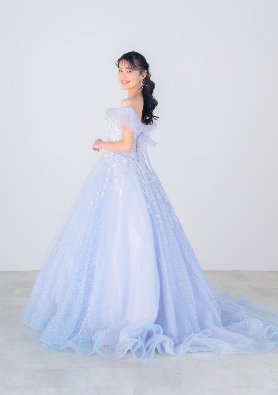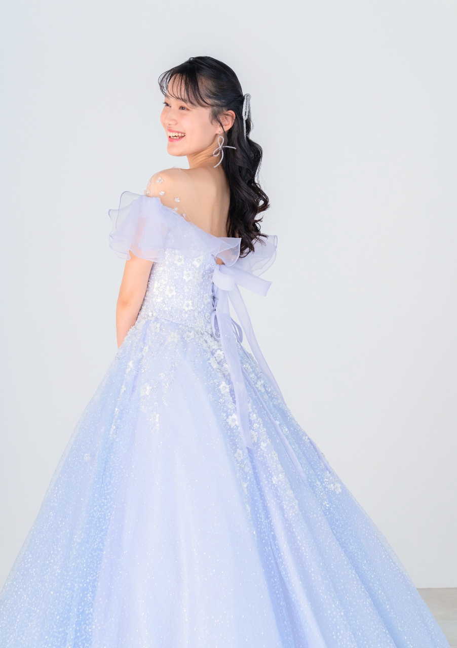 天使の羽を袖で表現したひらひらのオフショルダーがポイント。デコルテのイリュージョンチュールに散らしたレースのスパンコールはお花のモチーフでフェミニンさが漂う1着。