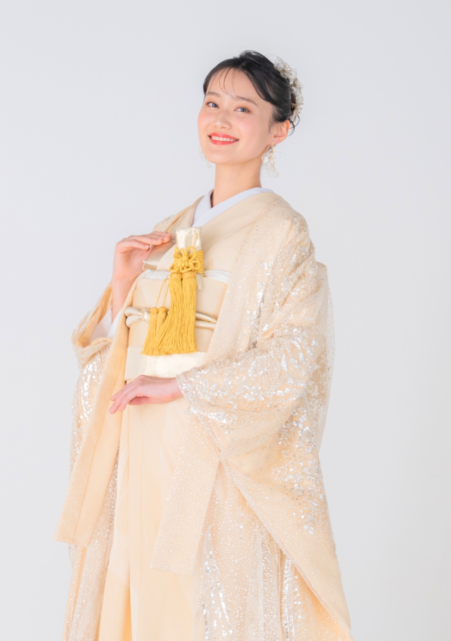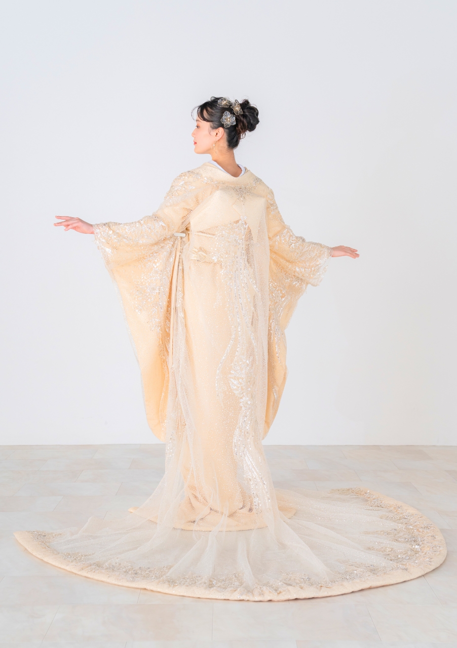 透け感が美しいオーガンジー和装。動くたびに羽織に散りばめられたグリッターが反射し、キラキラと輝きます。