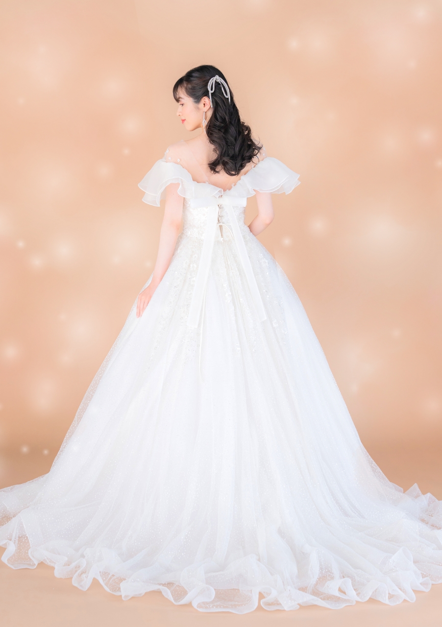 天使の羽をイメージした、ひらひらオーガンジーのオフショルダーのドレス。 デコルテに散らしたビジューで縫われた小さなお花もロマンチックです。バックのリボンのホースのような立体感も珍しいデザインです。ドレスの本体の上半身にはグリッターの上に小花を散らしたレースをあしらっています。 ひらひらの衿はヨークと一緒に縫われていて、取り外し可能です。 フリルの衿を外すと二の腕を通る細目の袖が付いたキラキラのAラインドレスになります。